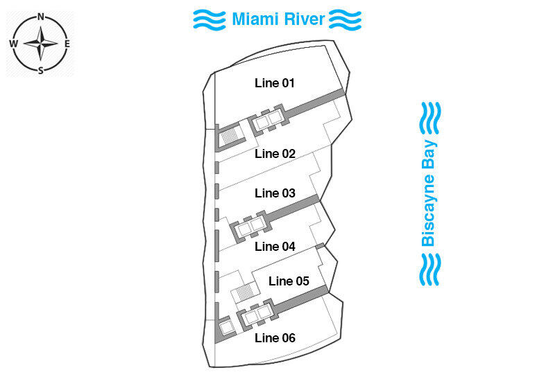 - Planos contemporáneos de concepto abierto y fluido con residencias y áticos de uno, dos, tres y cuatro dormitorios.- Ascensores privados y vestíbulos de entrada en todas las viviendas, con dos ascensores que dan directamente a cada una de ellas.- Ventanas y puertas correderas de cristal del suelo al techo, tintadas, resistentes a los impactos y energéticamente eficientes, con vistas panorámicas de la bahía de Biscayne, el río Miami y las luces y el horizonte de la ciudad de Miami desde todas las viviendas.- Amplias terrazas privadas de dos metros de profundidad, y terrazas envolventes en las unidades de esquina, con barandillas de cristal para disfrutar de vistas despejadas.- Techos lisos de 3 metros de altura en las plantas típicas, que alcanzan los 3 y 4 metros en los áticos.