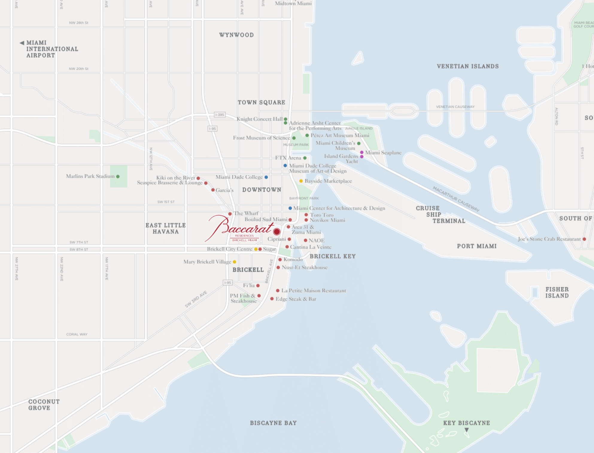 BACCARAT SE ENORGULLECE DE PRESENTAR SU PRIMERA COLECCIÓN DE RESIDENCIAS EN EL MERCADO DE MIAMI. ILUMINADA POR EL INFINITO RESPLANDOR DEL SOL, ESTA ALTÍSIMA TORRE SE ALZARÁ RADIANTE EN EL PASEO MARÍTIMO DONDE EL RÍO SE ENCUENTRA CON LA BAHÍA, EN EL CORAZÓN DE LAS RESPLANDECIENTES LUCES DE LA CIUDAD, COMBINANDO LO MEJOR DE BRICKELL CON UN DISEÑO ILUMINADO, UN SERVICIO INGENIOSO Y ANIMADOS SERVICIOS FRENTE AL MAR.